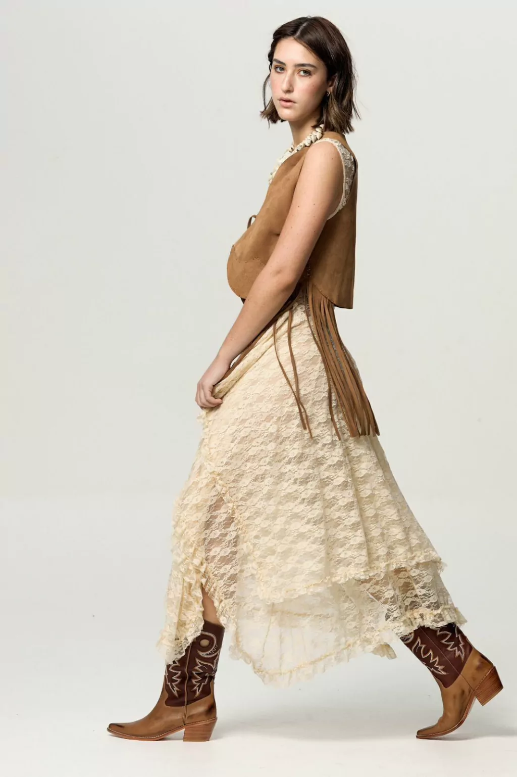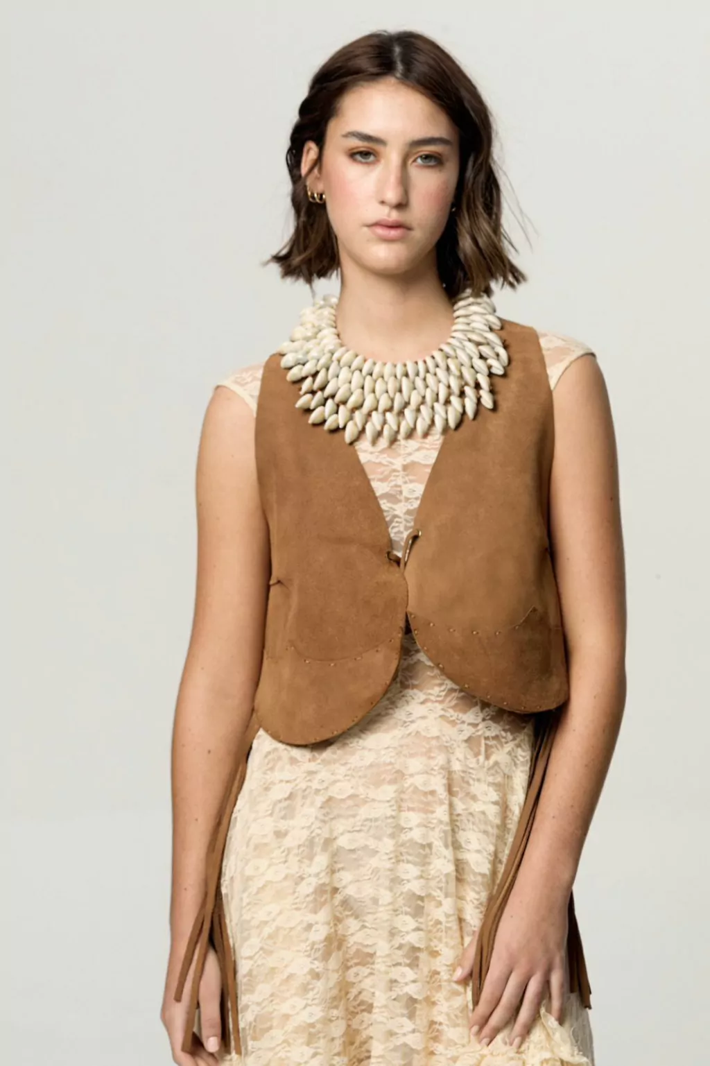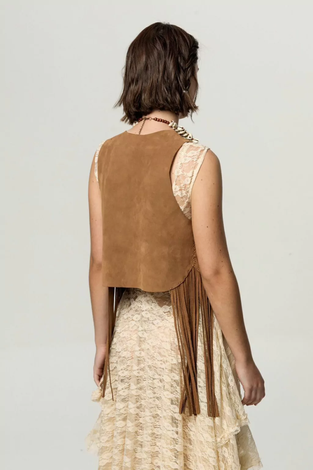 Chaleco DOMA color suela , hecho en cuero gamuzado y terminaciones en flecos.
