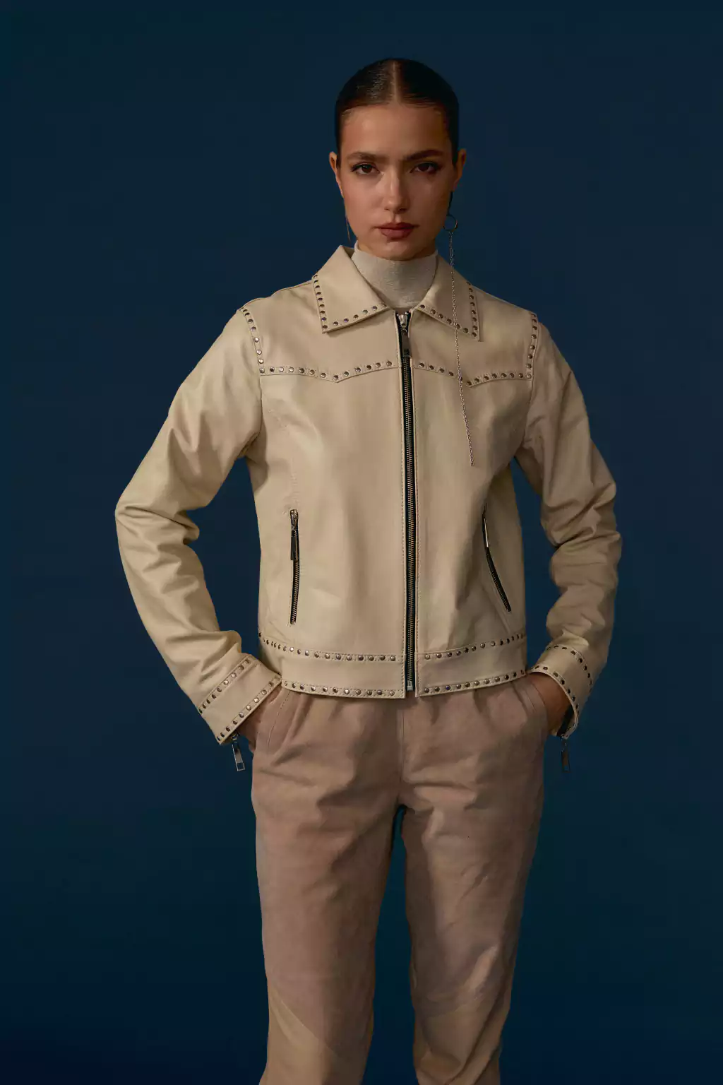Jacket Lucero en Natural. Realizado 100% en cuero argentino. Detalles en tachas. Disponible en variantes negro y habano.