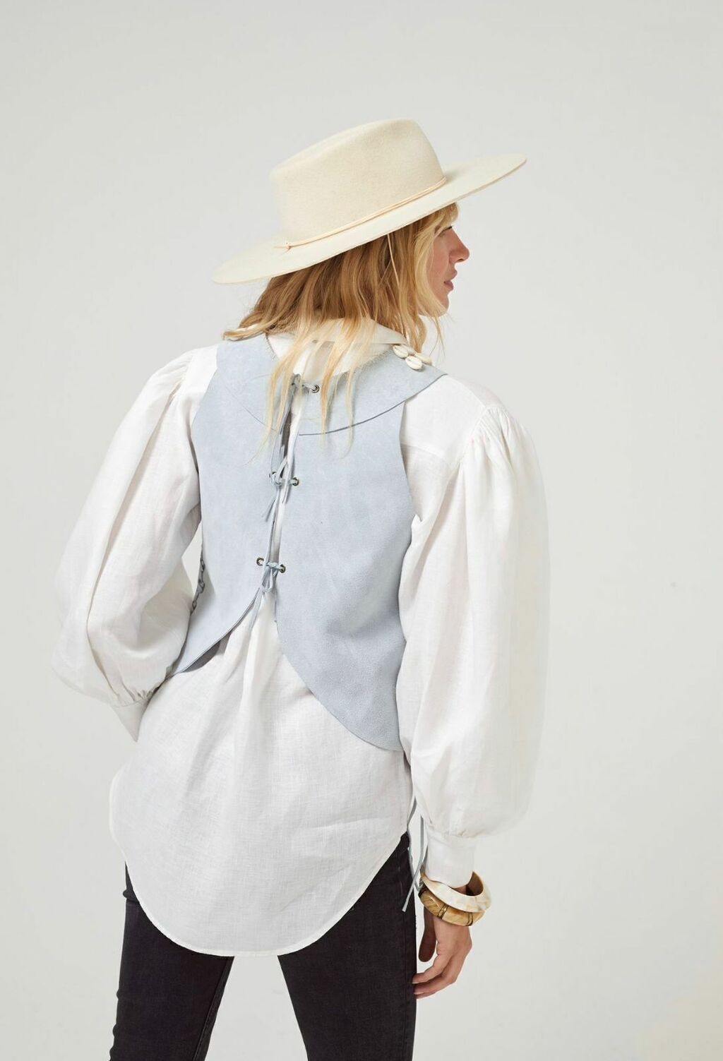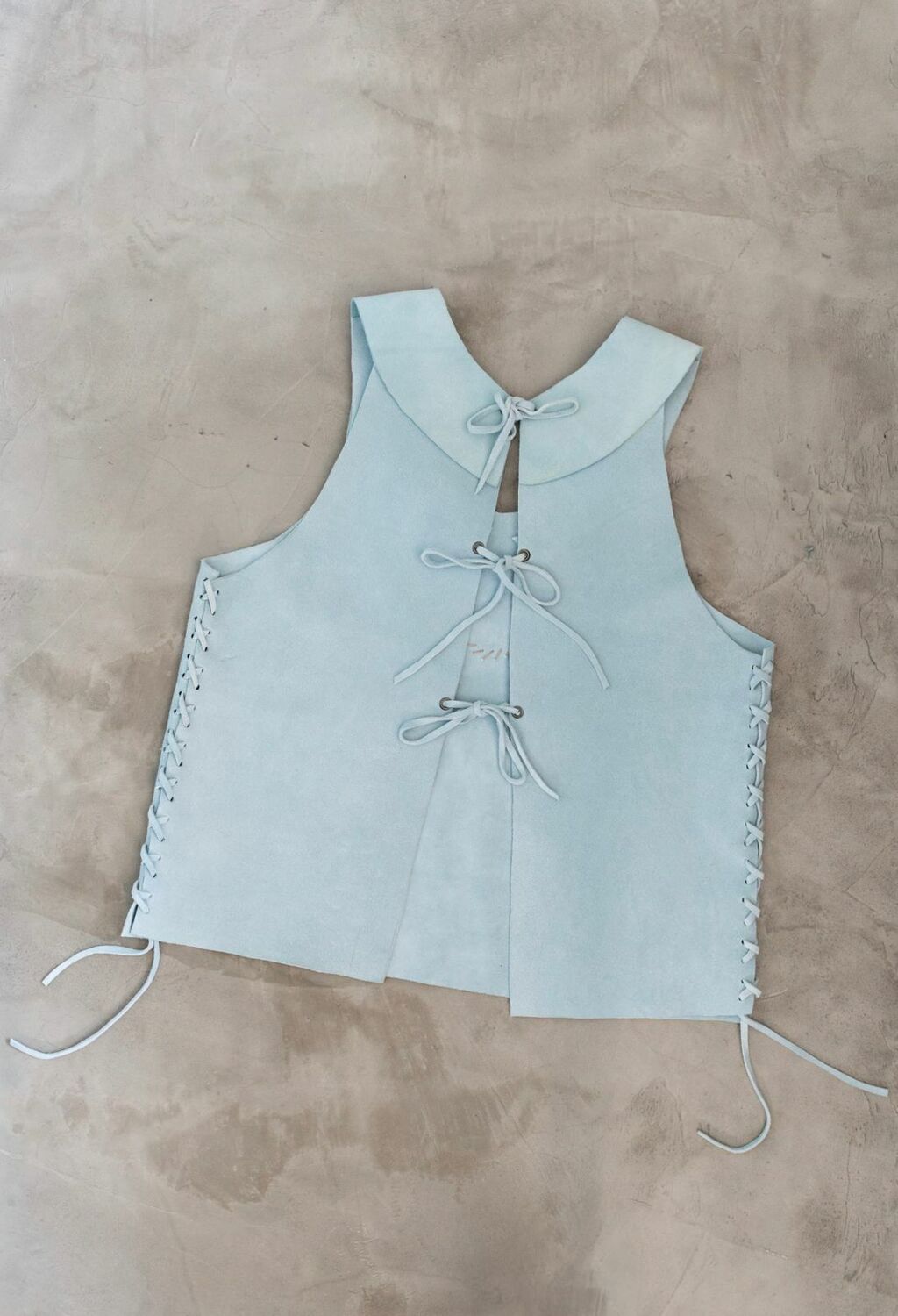 Top chaleco hecho a mano en cuero gamuzado, con detalles en cuero y cuello de caracoles. Color celeste.